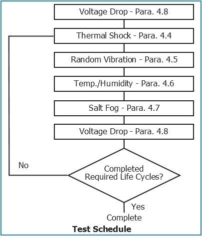 The test steps include voltage drop, thermal shock, random vibration, temperature/humidity, salt fog testing and a second voltage drop test.