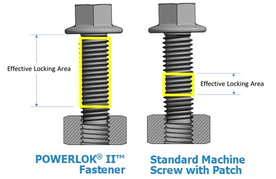 - There are no positional considerations. The locking feature is throughout the full length of the thread. One common fastener can be used in multiple applications.