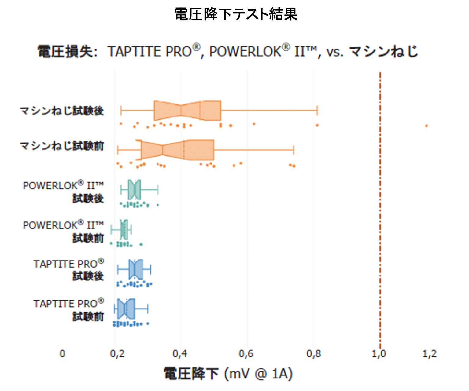 重要なポイントは、TAPTITE PRO®スレッドフォーミングファスナーとPOWERLOK®II™ロッキングファスナーは、従来のマシンねじよりも電圧降下が60%少なく、安定性が80%高いことです。 変動の少ないこの低い電圧降下は、多くの業界におけるアース用締結にとって重要です。