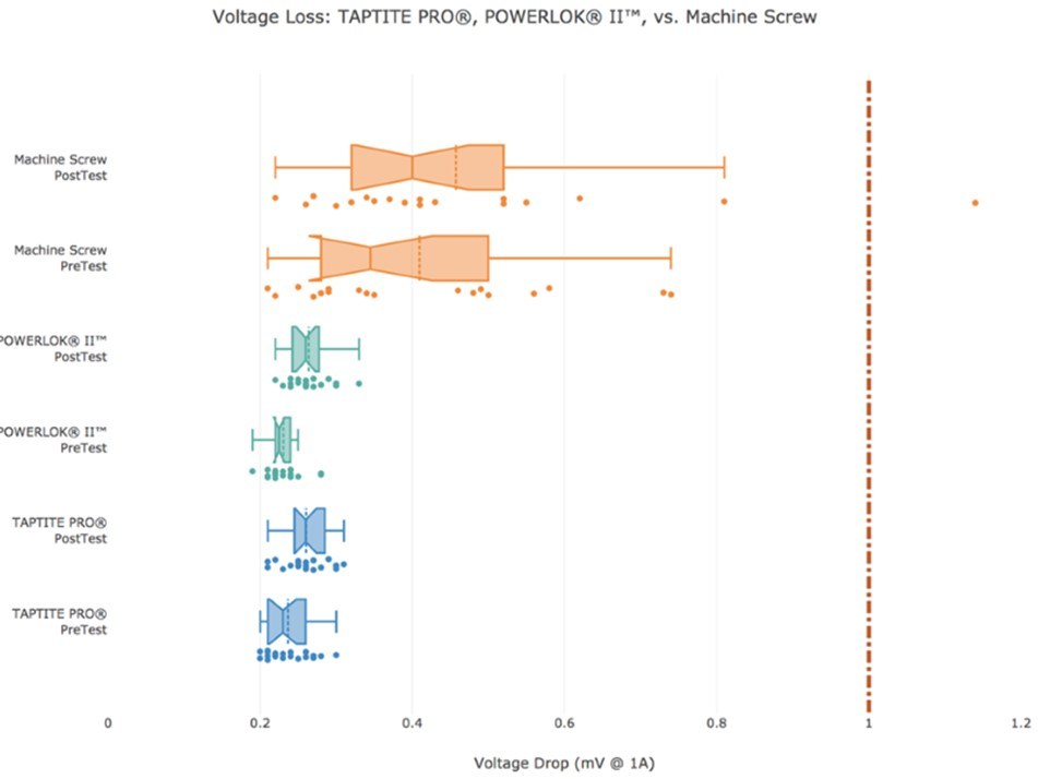 The key takeaways are that TAPTITE PRO® thread-forming fasteners and POWERLOK® II™ thread-locking fasteners yielded 60% less voltage drop with 80% more consistency than conventional machine screws. This low voltage drop with low variability is important for grounding applications across industries.